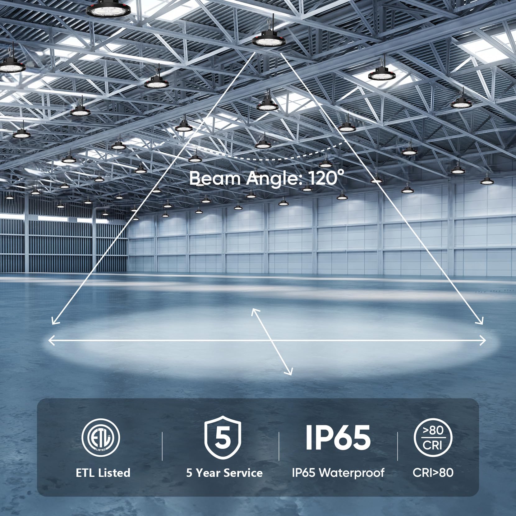 ETL-certified for safety and quality: This UFO LED high bay light is ETL-certified, meets rigorous safety standards, and is designed for reliable performance. It includes 5-year service coverage, with responsive support to help keep your lights performing as expected.