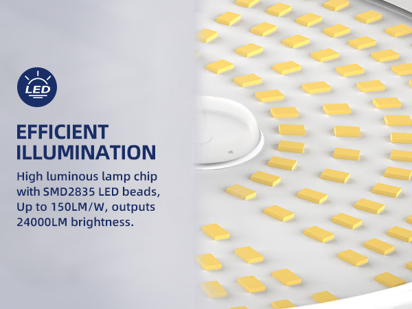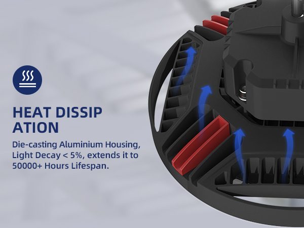 Waterproof Design and Versatile Applications: This LED garage light is suitable for both indoor and outdoor high-bay lighting, capable of performing well even in humid conditions, such as garages, factories, barns, warehouses, workshops, warehouses, supermarkets, exhibition halls, stadiums, gyms, hangars, etc. High-quality material and long lifespan: Made with a die-cast aluminum housing, this high bay light features exceptional heat dissipation, keeping light decay below 5%, extending the lifespan of this commercial high bay light to 50,000 hours.